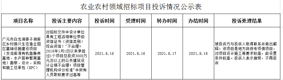 農(nóng)業(yè)農(nóng)村領(lǐng)域招標(biāo)項(xiàng)目投訴情況公示表