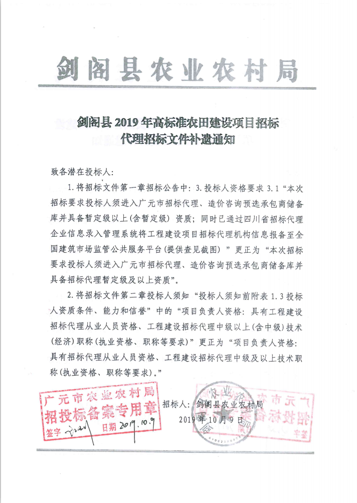 劍閣縣2019年高標準農(nóng)田建設項目(招標代理)補遺