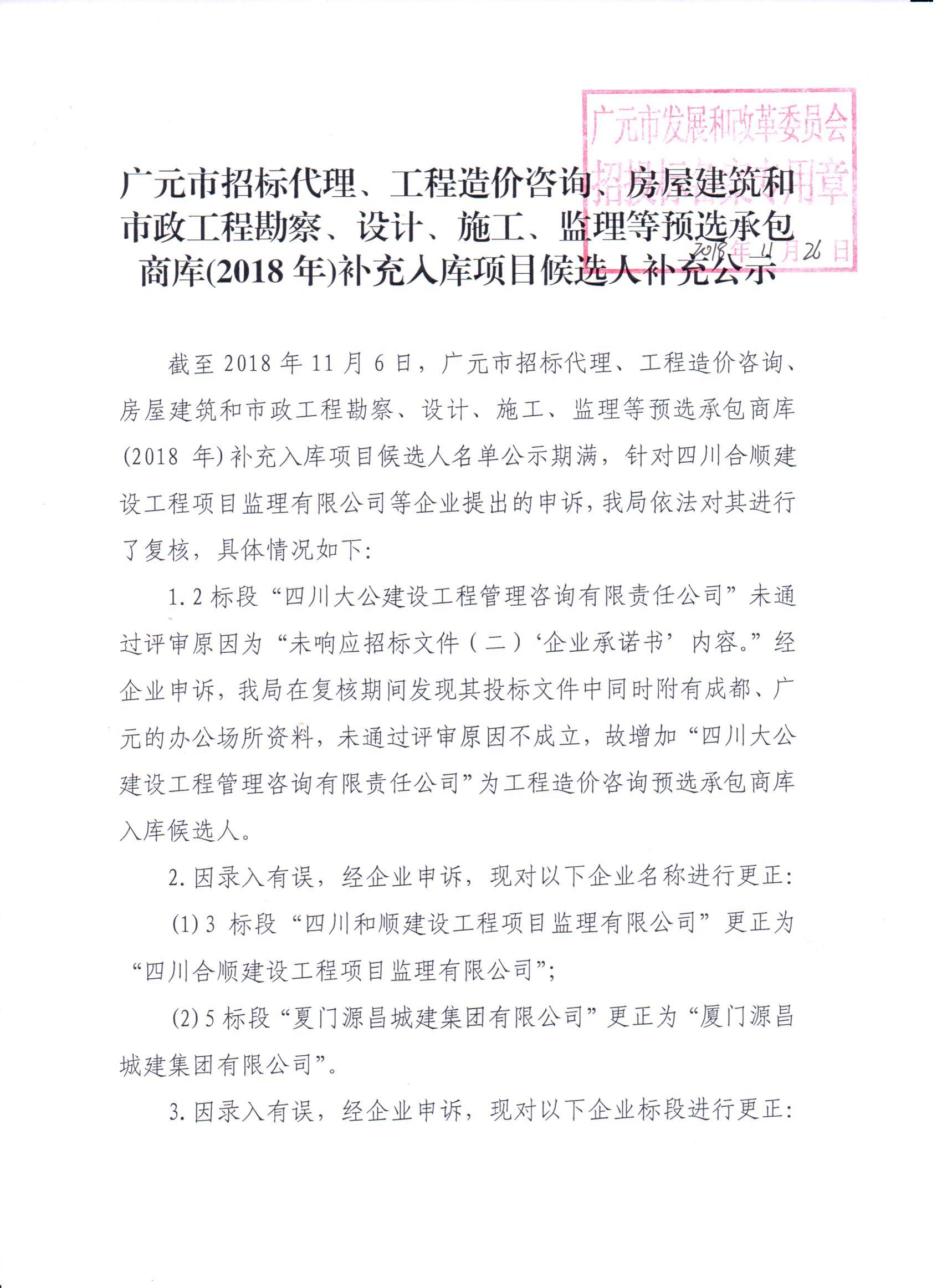 廣元市招標(biāo)代理、工程造價(jià)咨詢、房屋建筑和市政工程勘察、設(shè)計(jì)、施工、監(jiān)理等預(yù)選承包商庫(kù)(2018年)補(bǔ)充入庫(kù)項(xiàng)目候選人補(bǔ)充公告