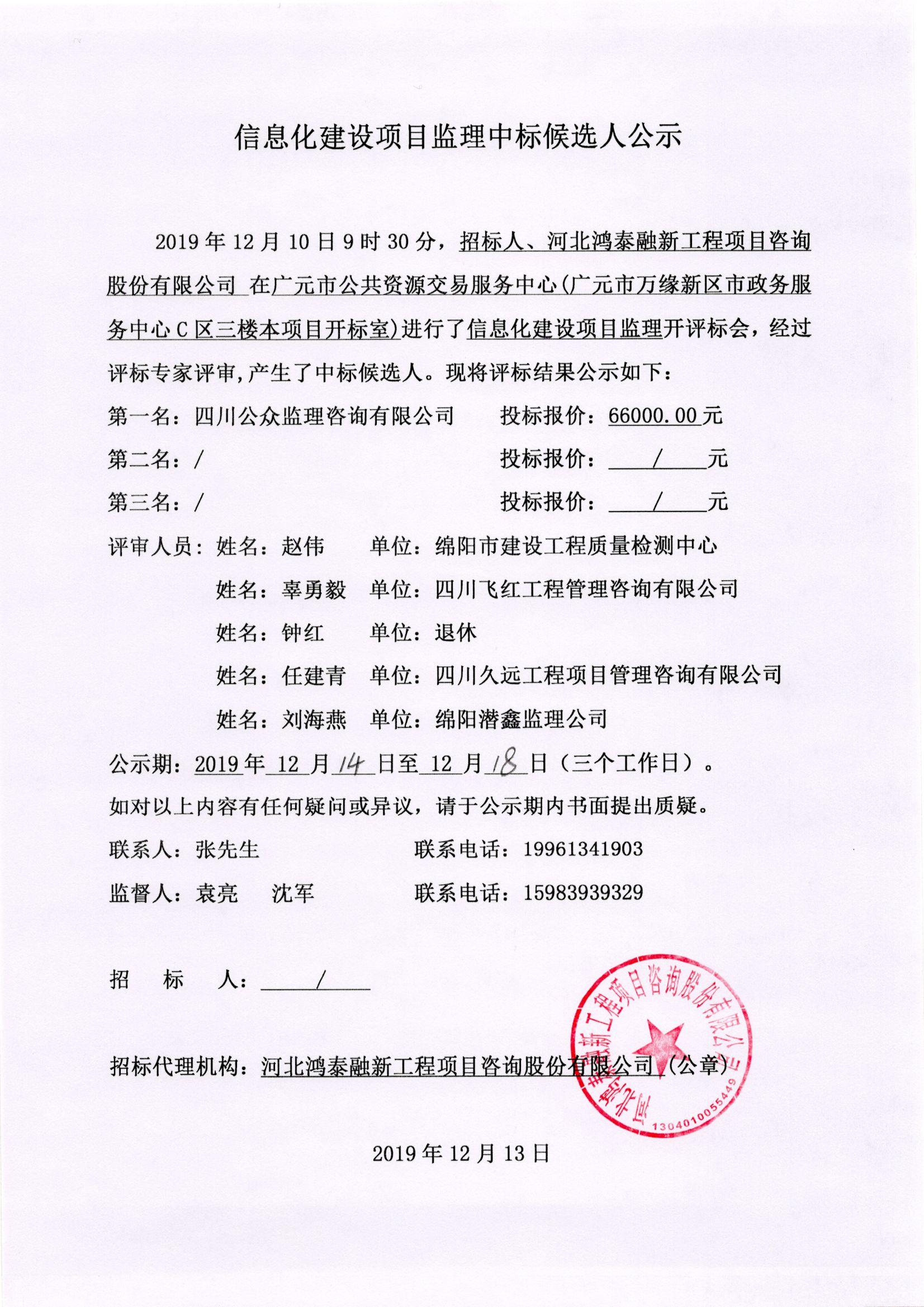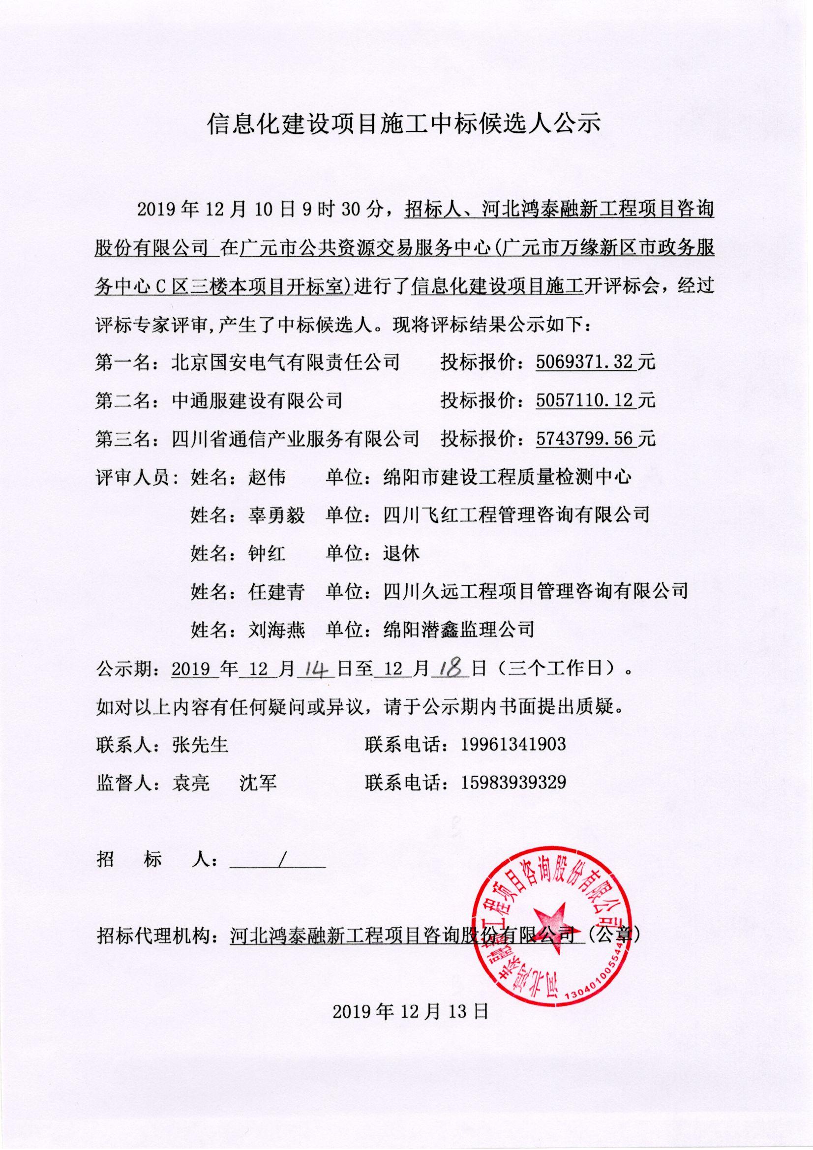 某部信息化建設(shè)項(xiàng)目施工、監(jiān)理中標(biāo)候選人公示